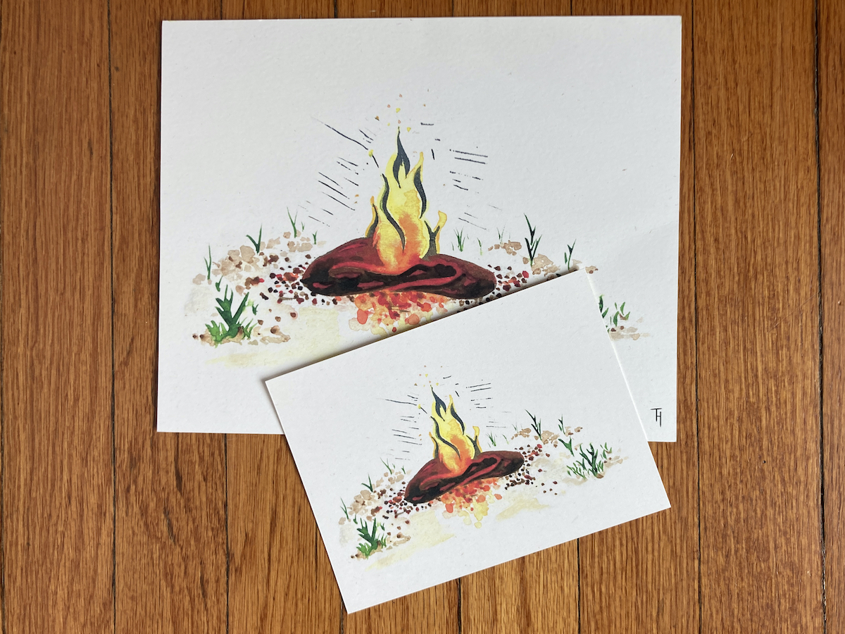 The design comes from a print Maxx and Toby collaborated on a few years ago, for the RSVP card for their Beltane potluck & bonfire. They worked together to design, print, and paint this bonfire goddess figure in celebration of the spring and summer holidays traditionally celebrated with and around a bonfire, like Beltane, Nowruz, Walpurgis Night, Easter, and Midsummer Eve.