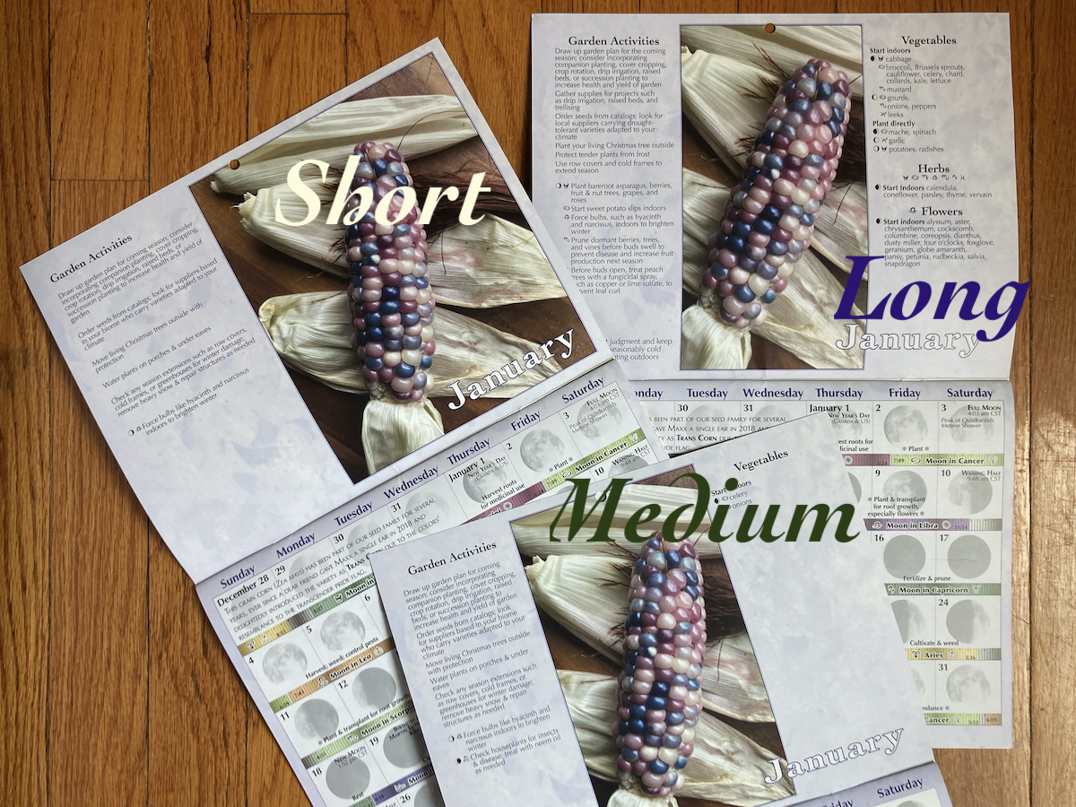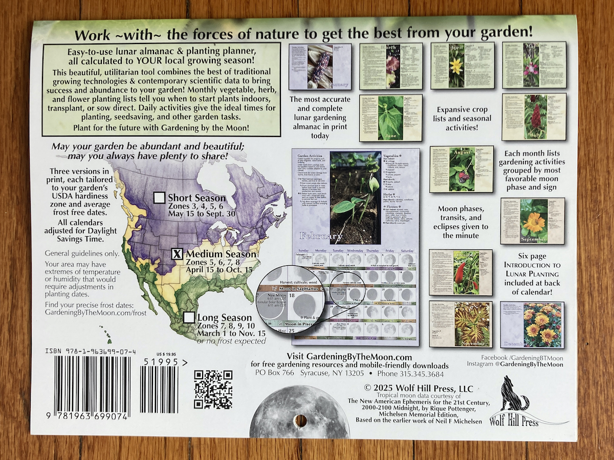 Medium Season version of the Gardening by the Moon Lunar Almanac and Planting Guide wall calendar. Printed with low-VOC soy-based ink on recycled, recyclable paper! Coated inner pages are slightly glossy and can be written on with pen, pencil, or marker for all your color-coding needs.