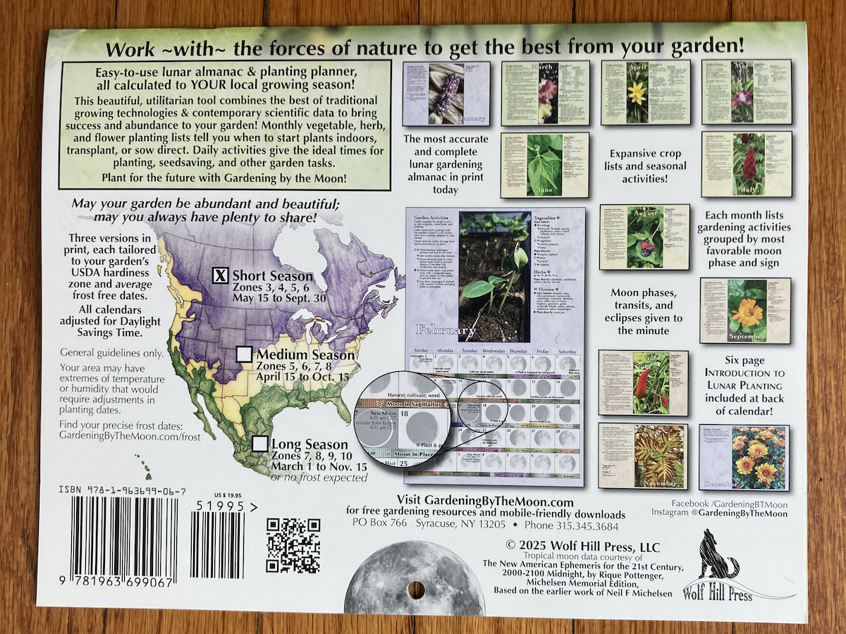 Short Season version of the Gardening by the Moon Lunar Almanac and Planting Guide wall calendar. Printed with low-VOC soy-based ink on recycled, recyclable paper! Coated inner pages are slightly glossy and can be written on with pen, pencil, or marker for all your color-coding needs.